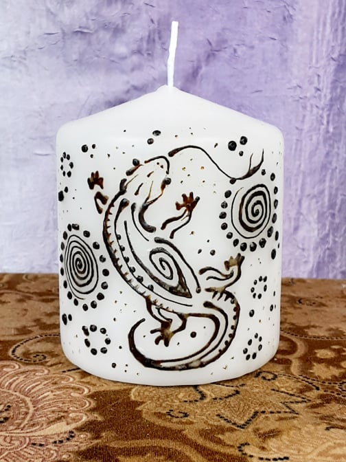 This 3 x 3 Lizard pillar candle was hand decorated using henna paste & sealed with wax. The candle will burn for approximately 25 -30 hours, illuminating the design as it burns cleanly down the center. Lizards can represent internal power, they have the ability to regenerate lost parts. Burning this candle will help recall important things you may have lost or forgotten.