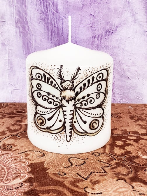 Moths search for light in the dark. They are nocturnal creatures that carry the wisdom of the underworld. They represent clairvoyance, determination, and the revealing of secrets. This 3 x 3 moth candle was hand decorated using henna paste & sealed with wax. The candle will burn for approximately 25 -30 hours, illuminating the design as it burns cleanly down the center. The moth on this candle is embellished with glow in the dark elements, and when exstinguished parts of the wings will glow in the dark!
