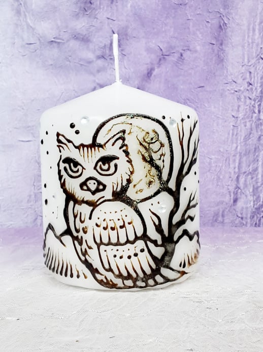 This 3 x 3 owl pillar candle was hand decorated using henna paste & sealed with wax. The candle will burn for approximately 25 -30 hours, illuminating the design as it burns cleanly down the center. Owls represent magic, mystery, & ancient knowledge. As nocturnal creatures they have a deep connection to the moon & the sacred feminine. This candle includes crystal gem embelishments.