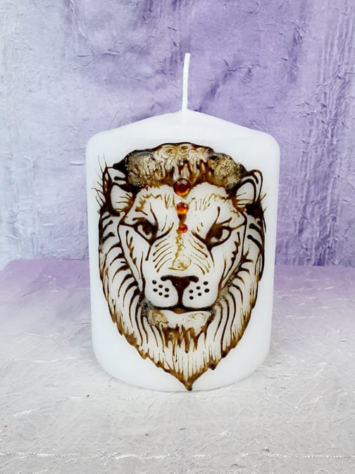 This 3 x 4 hand decorated fierce Lion pillar candle was decorated using henna paste & sealed with wax. The candle will burn for approximately 35 - 40 hours, illuminating the design as it burns cleanly down the center. The intention behind burning this candle is the strength of the lion, & power within grace.