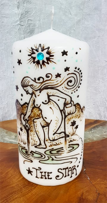 This 4 x 6 hand decorated pillar candle was decorated using henna paste & sealed with wax. The candle will burn for approximately 80 hours, illuminating the design as it burns cleanly down the center. This magical candle was decorated free hand based on the 19th tarot card in the major arcana, The Star. When burned, this candle conjures all of the beauty and abundance from this card & is a true joy to meditate on & experience.
