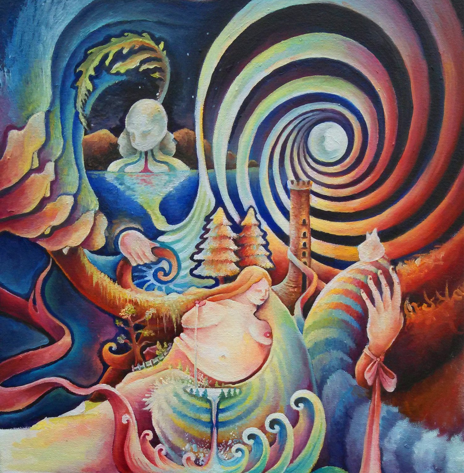 This original psychedelic oil painting relates to cosmic contact and ancestry of extra-terrestrial and other worldly origins. No one really knows how humans came to this Earth, but we do know that what society has become and asks of us is a huge distraction. Living on Earth has become so structured we have forgotten where we really came from and who we really are. Have you ever received messages from another realm?